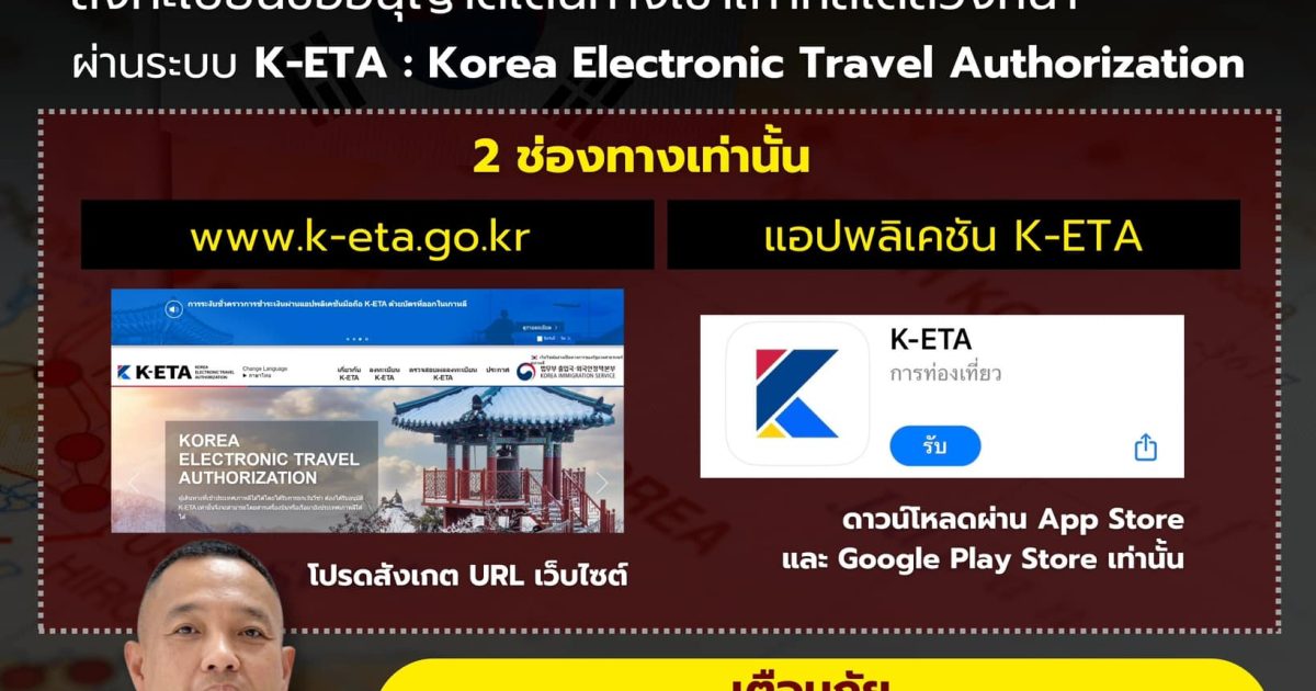 เว็บไซต์สำหรับลงทะเบียน K-ETA ของจริงคือ www.k-eta.go.kr เท่านั้น ส่วนแอปพลิเคชันลงทะเบียน K-ETA สำหรับโทรศัพท์มือถือ สามารถดาวน์โหลดได้ผ่าน App Store และ Google Play Store ที่ https://apps.apple.com/th/app/k-eta/id1562976724 และ https://play.google.com/store/apps/details?id=kr.go.keta