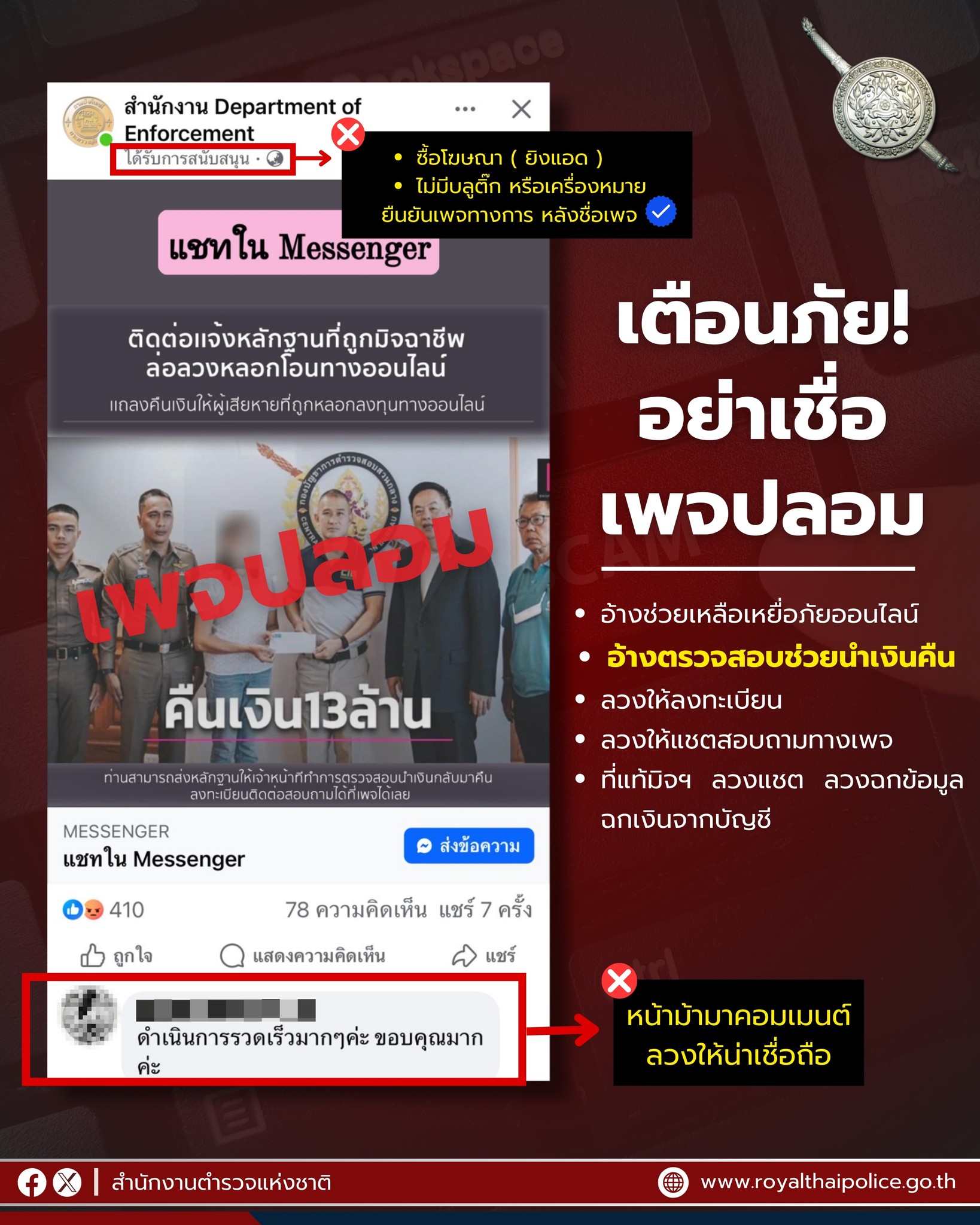 กำลังระบาด เพจปลอมทำให้หลงเชื่อว่าเป็นหน่วยราชการอ้างว่าช่วยเหลือเหยื่ออาชญากรรมออนไลน์ ช่วยตรวจสอบ